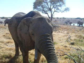 Í dag fórum við í ferðalag til Etosha sem er stærðar þjóðgarður, það er allveg meiriháttar þar. Það er fullt af dýrum af öllum stærðum og gerðum. Þegar við komum þangað voru fullt af fílum við vatnsbólið og voru nokkrir svo littlir að þeir gátu varla staðið. Síðan þegar sólin hafði sest sátum við og horfðum á öll dýrin sem komu til að drekka meðal annars einn gíraffi sem að alltí einu hætti að drekka og hljóp burtu og þá sá ég ljón sem hafði verið að læðast aftan af honum, ljónið kom síðan tvisvar sinnum í viðbót framhjá.Það var bara of dimmt til að taka mynd af því. Emil var að vona að ljónið tæki eina antilópu svo að hann sæi og biðum við lang fram á kvöld en honum varð ekki af ósk sinni. Þetta var þriðja skifti sem ég kom til Etosha og þetta var besta ferðin því að það voru svo margir fílar við vatnsbólið(milli 75 og 80) og svo þegar við fórum úr garðinum keyrðum við fram hjá ca 20 gíröffum sem gengu bara við hliðina á veiginnum og hápúnkturinn var svo auðvitað ljónið. Ég sagði við Emil eftir að við sáum alla fílan fyrr um dagin að það eina sem gæti slagið það var ef að við mindum sjá ljón og mér varð að ósk minni.